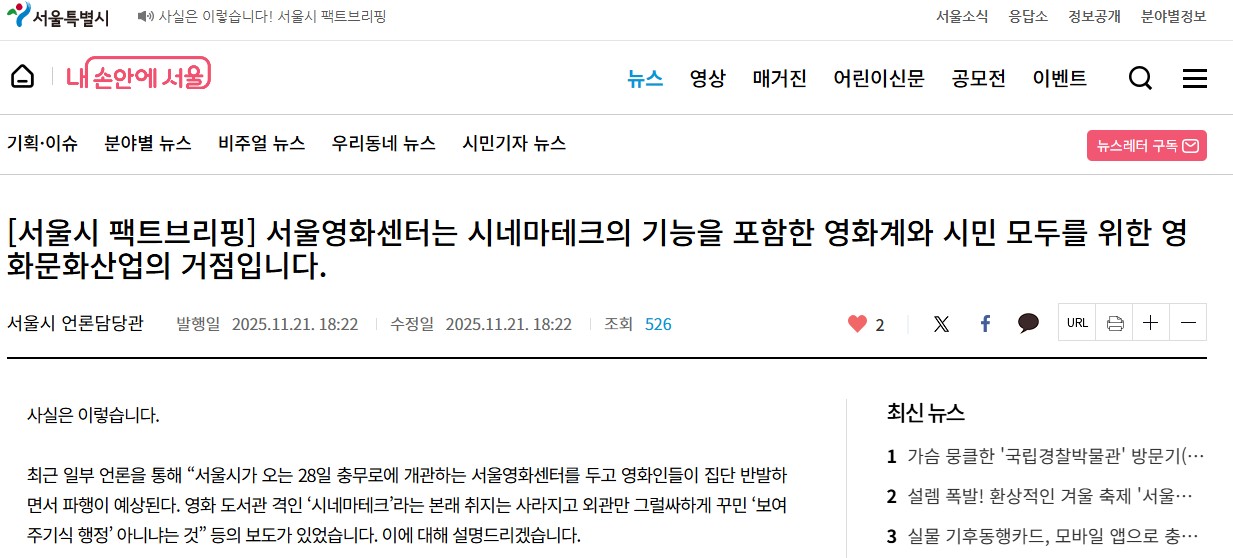 먼저, 2024년 서울시는 '시네마테크'에서 '서울영화센터'로 명칭을 바꿨습니다. 이에 대해 서울영상진흥위원회를 통해 시민들이 느끼기에 직관적으로 이해할 수 있도록 명칭했음을 설명했습니다.