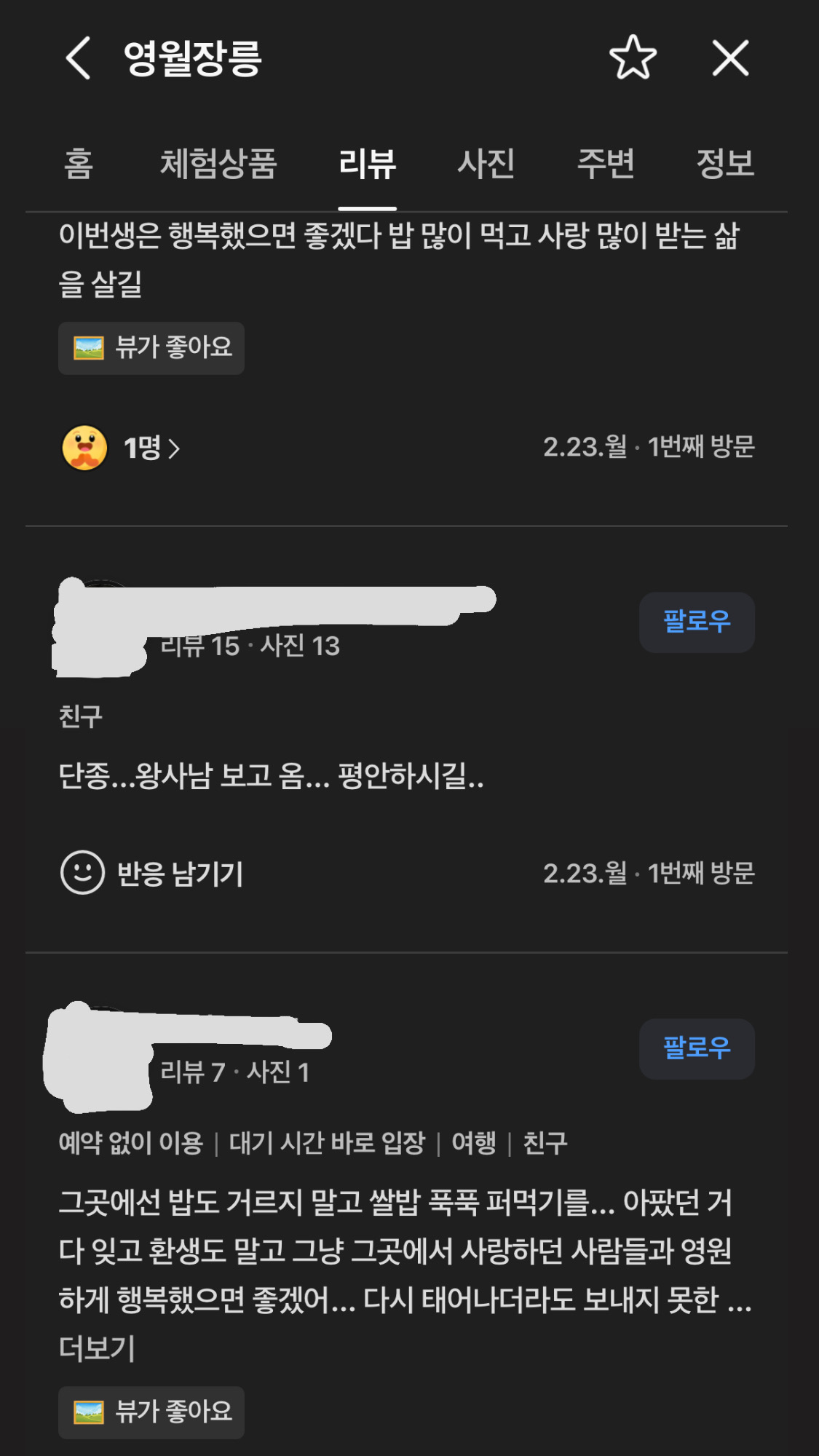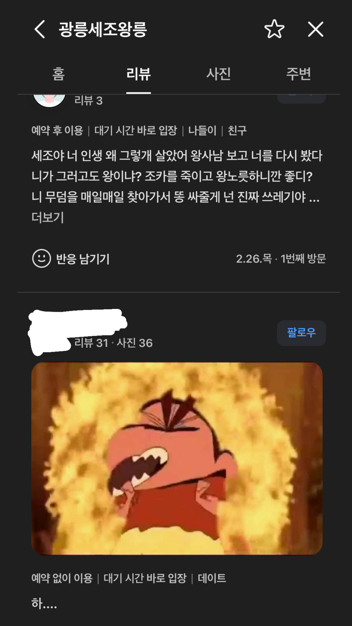 관객들은 영화 관람 후 카카오맵과 네이버맵을 찾아가 리뷰를 남기기 시작했습니다. 특히 세조의 묘인 광릉과 한명회의 묘에는 분노가 담긴 낮은 평점이 이어졌고, 단종의 묘인 영월 장릉에는 위로와 응원의 메시지가 쏟아지며 높은 평점을 기록하고 있습니다.